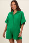 Details A textured maternity romper featuring front buttons, short sleeves and a collared neckline. Content + Care