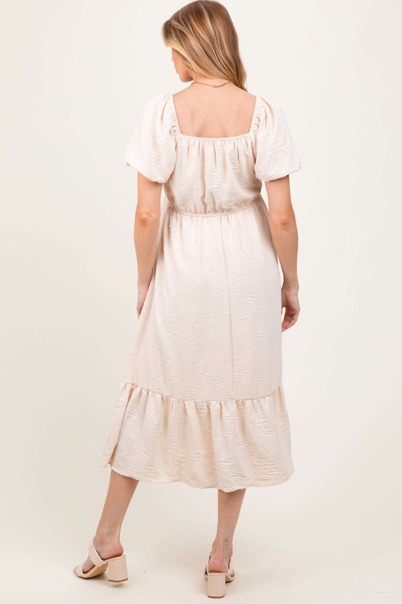 Cream Textured Square Neck Puff Sleeve Maternity Midi Dress