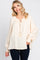 A solid long sleeve blouse with a keyhole tie closure at bust, lace inset details and smocked ruffle sleeves.