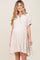 A linen maternity dress with short puff sleeves, a collar, front functioning buttons, a tiered skirt, and a frayed hem.
