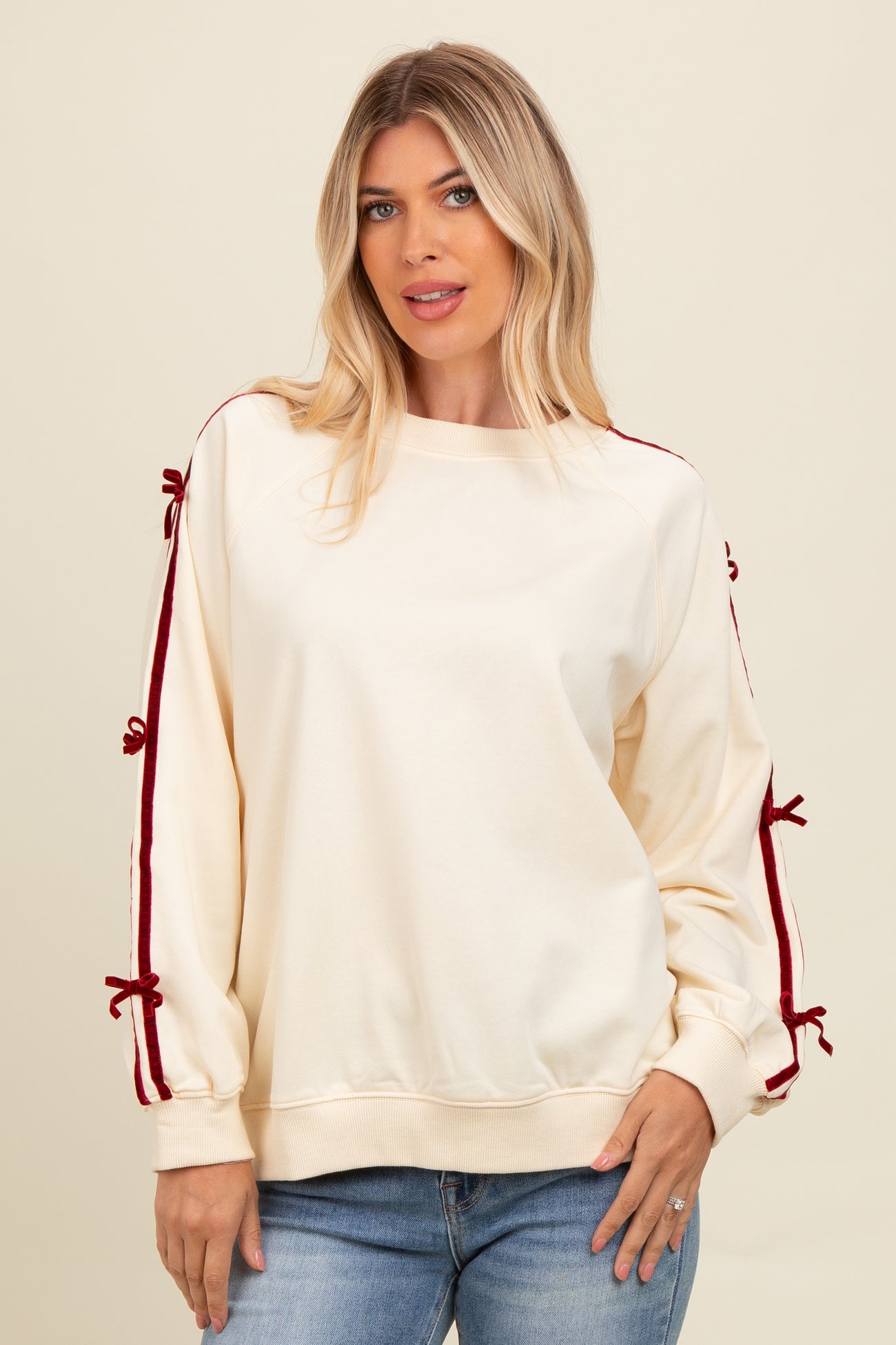 Cream Velvet Bow Accent Sweatshirt