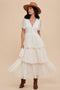 A floral maternity midi dress with a v-neckline, long cinched sleeves, a ruffle accent tiered skirt, and a back keyhole button closure. Body is lined.