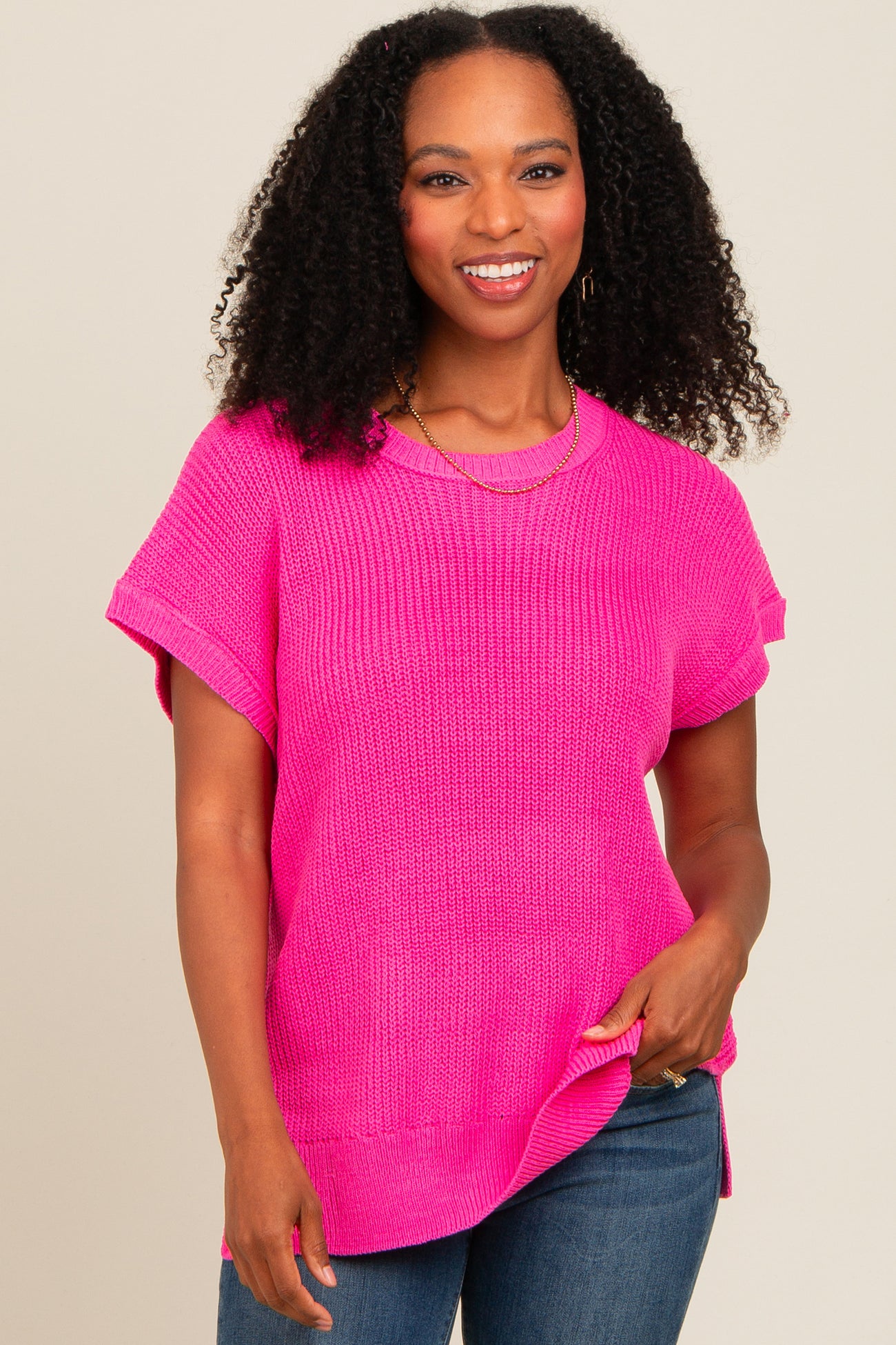 Fuchsia Dolman Short Sleeve Side Slit Maternity Sweater Top