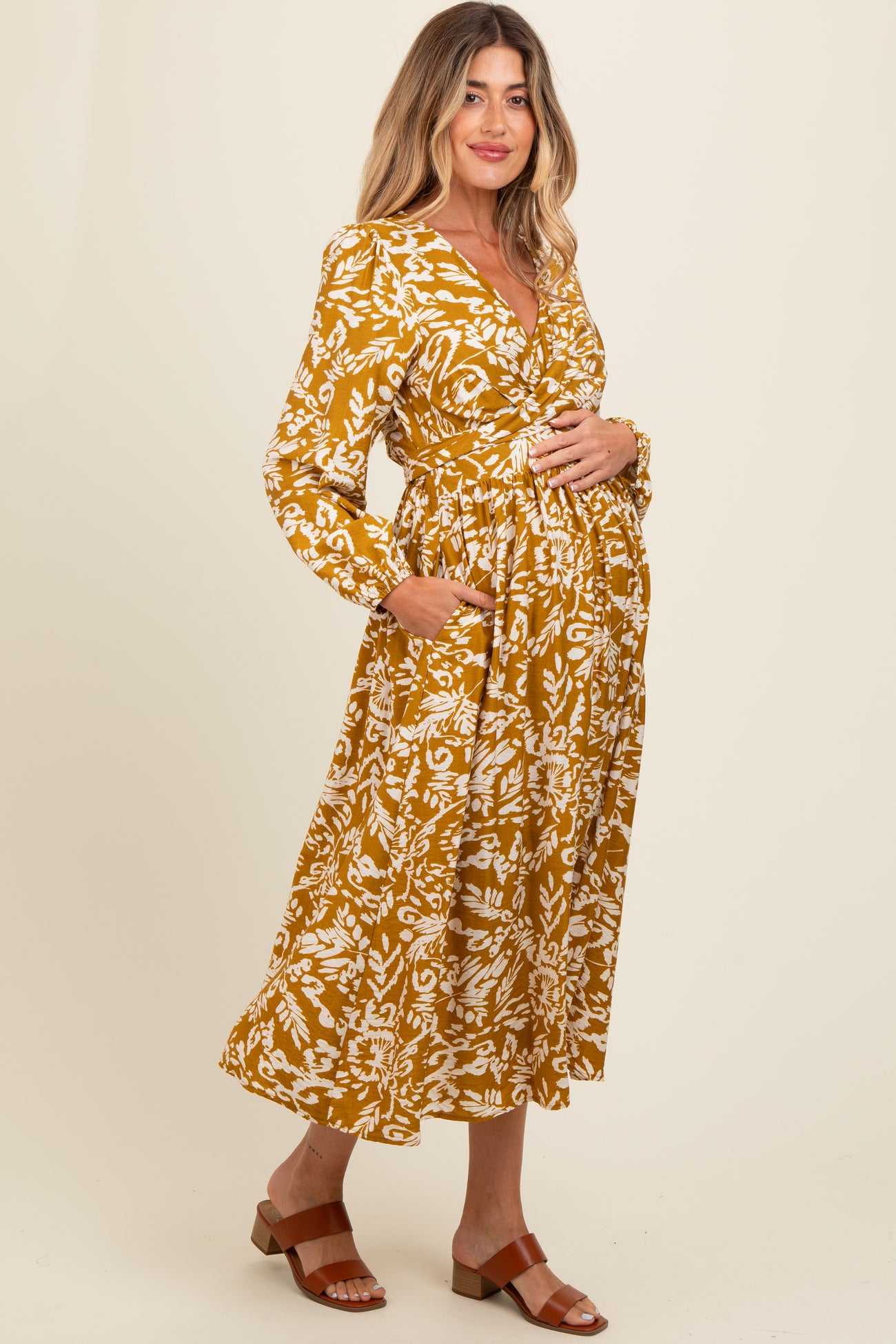 Gold Abstract Floral Gathered Front Maternity Midi Dress