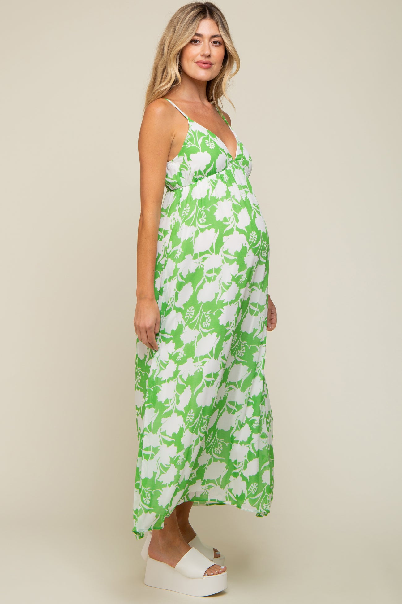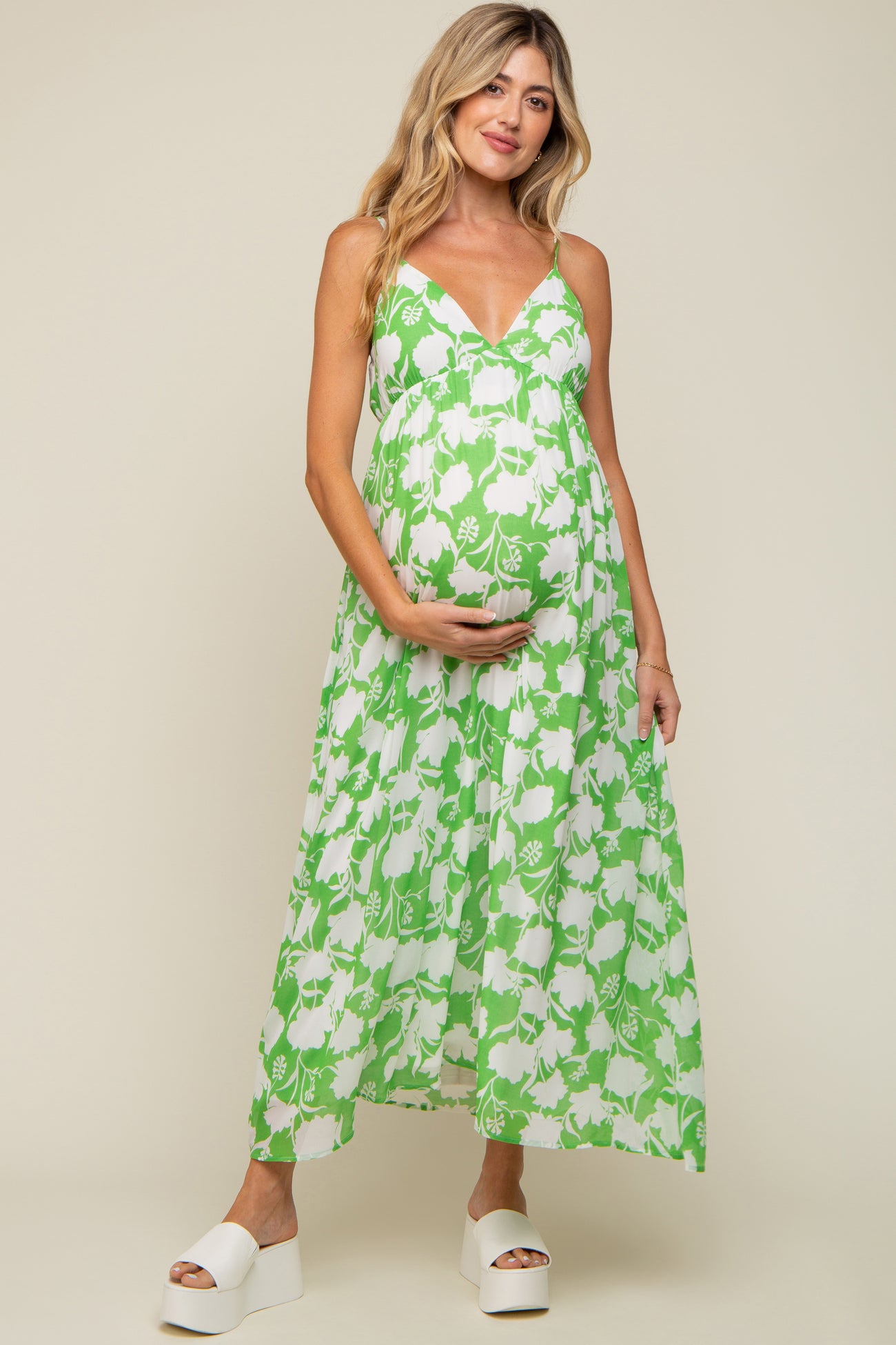 Green Floral Chiffon Deep V-Neck Sleeveless Maternity Maxi Dress