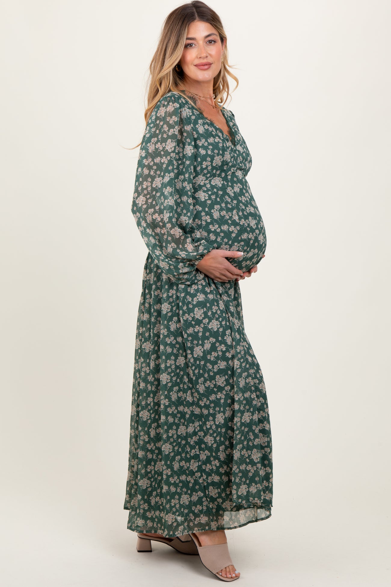 Green Floral Chiffon Lace Trim Back Tie Maternity Maxi Dress