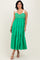 A maxi dress featuring self-tie ribbon shoulder straps, a tiered skirt, a smocked top and a sweetheart neckline.