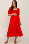 A solid maternity midi dress with a v-neckline, smocked bodice, and puff sleeves. Dress is partially lined.