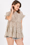 A solid midi dress with a smocked bust, flutter sleeves and ruffle hem. Pocketed.