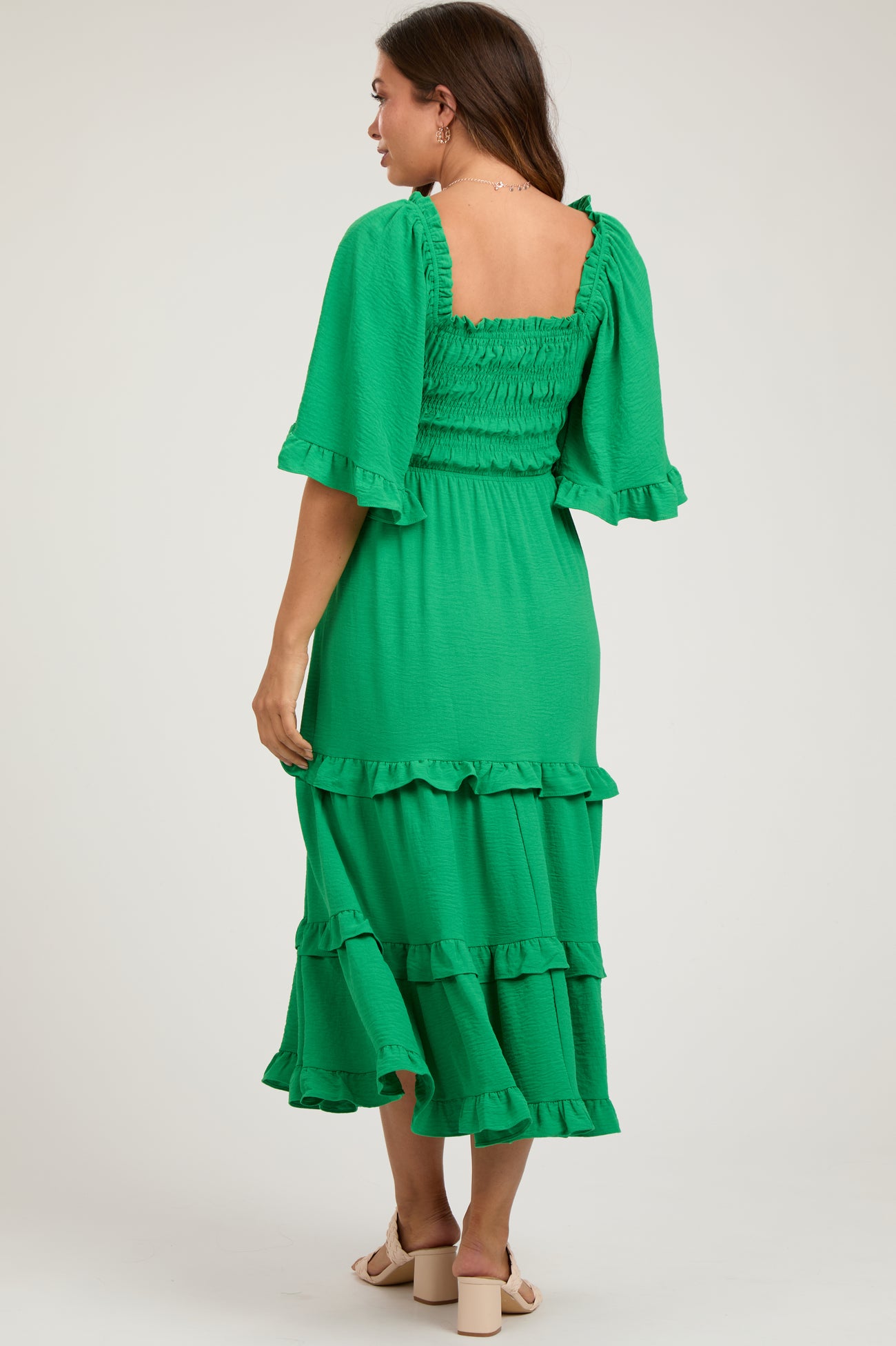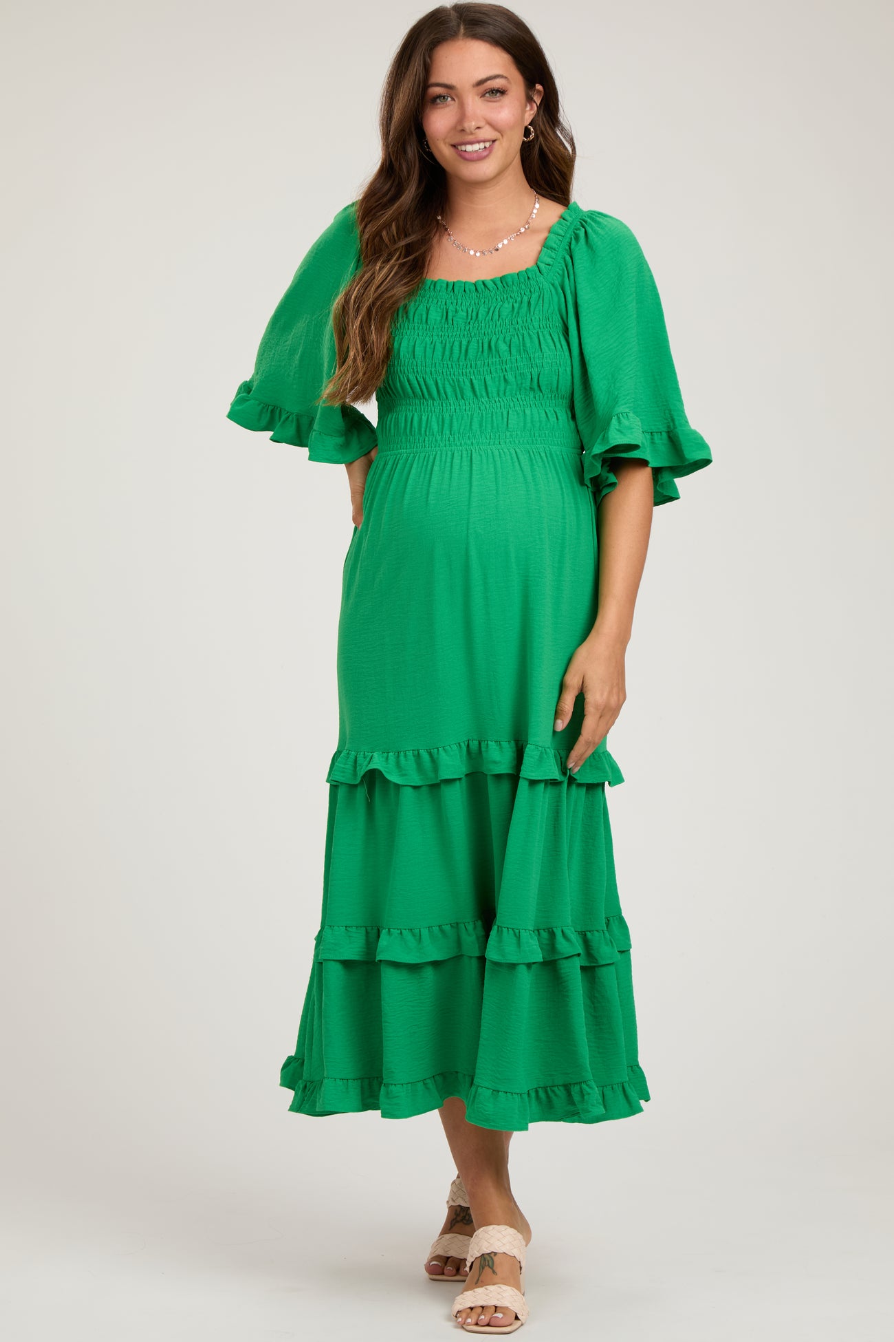 Green Smocked Ruffle Tiered Maternity Midi Dress