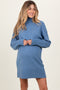 A solid tiered maternity midi dress in a textured material with a smocked bust and puff sleeves. Dress is double lined.