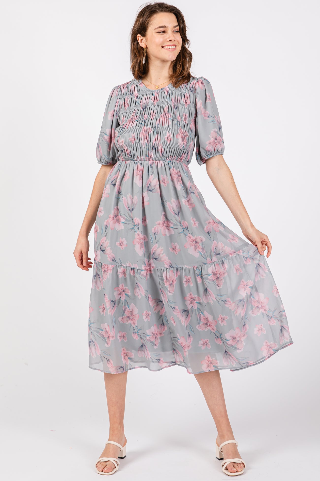 Grey Floral Smocked Ruffle Hem Maternity Midi Dress