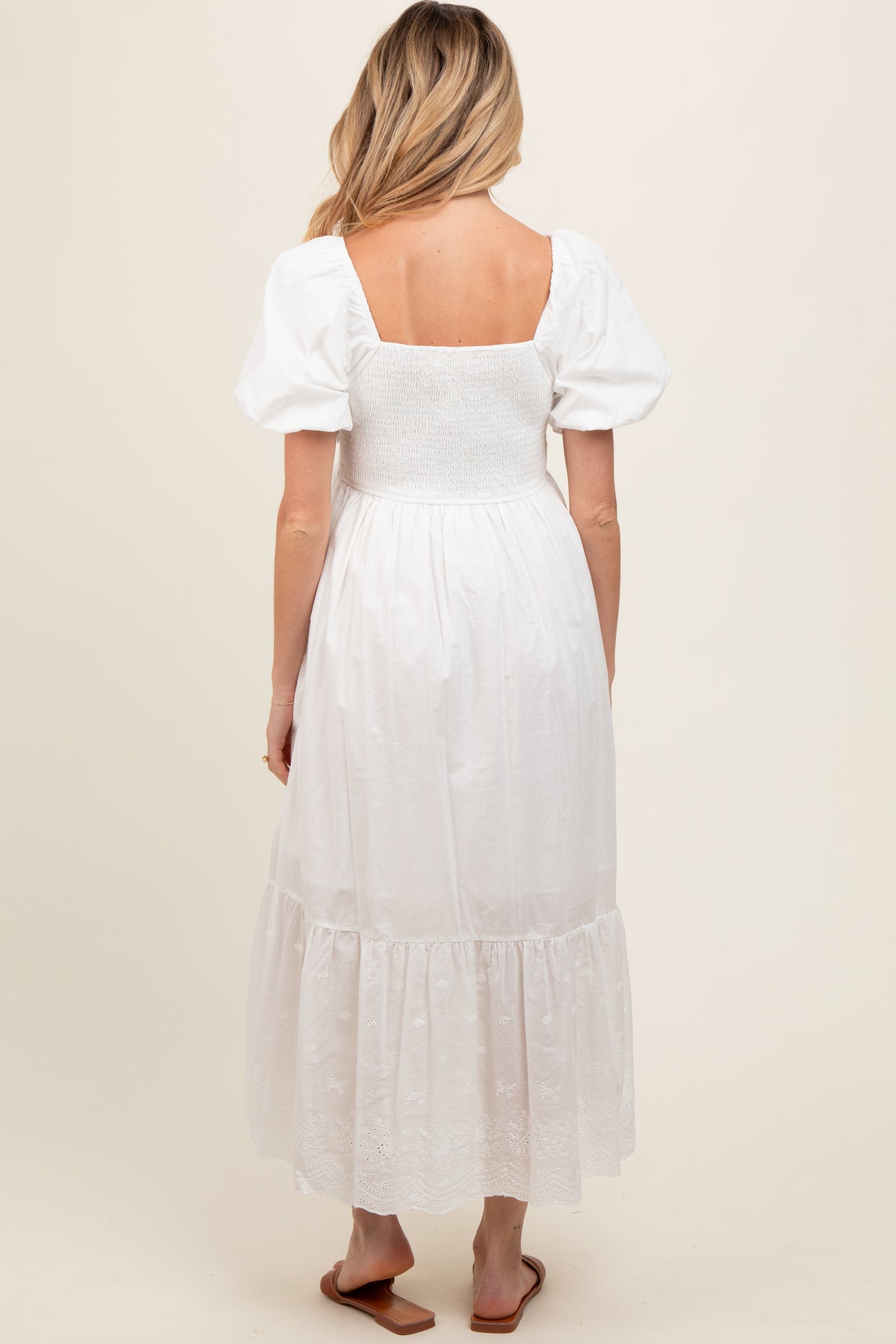 Ivory Eyelet Scalloped V-Neck Short Puff Sleeve Maternity Midi Dress