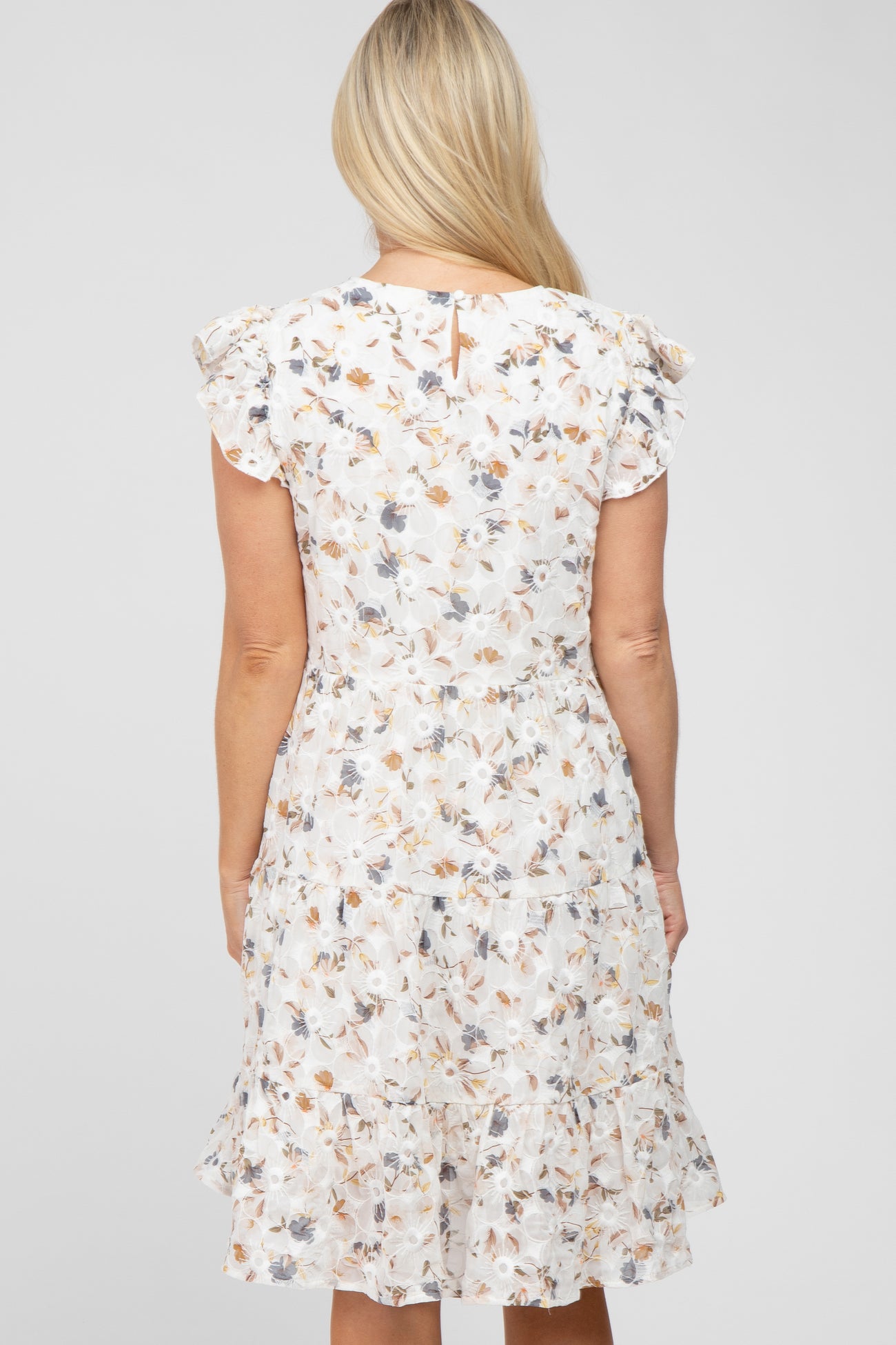 A floral printed and embroidered maternity dress with short cap sleeves, a rounded neckline, a tiered skirt, and a back keyhole closure. Dress is lined to prevent sheerness.