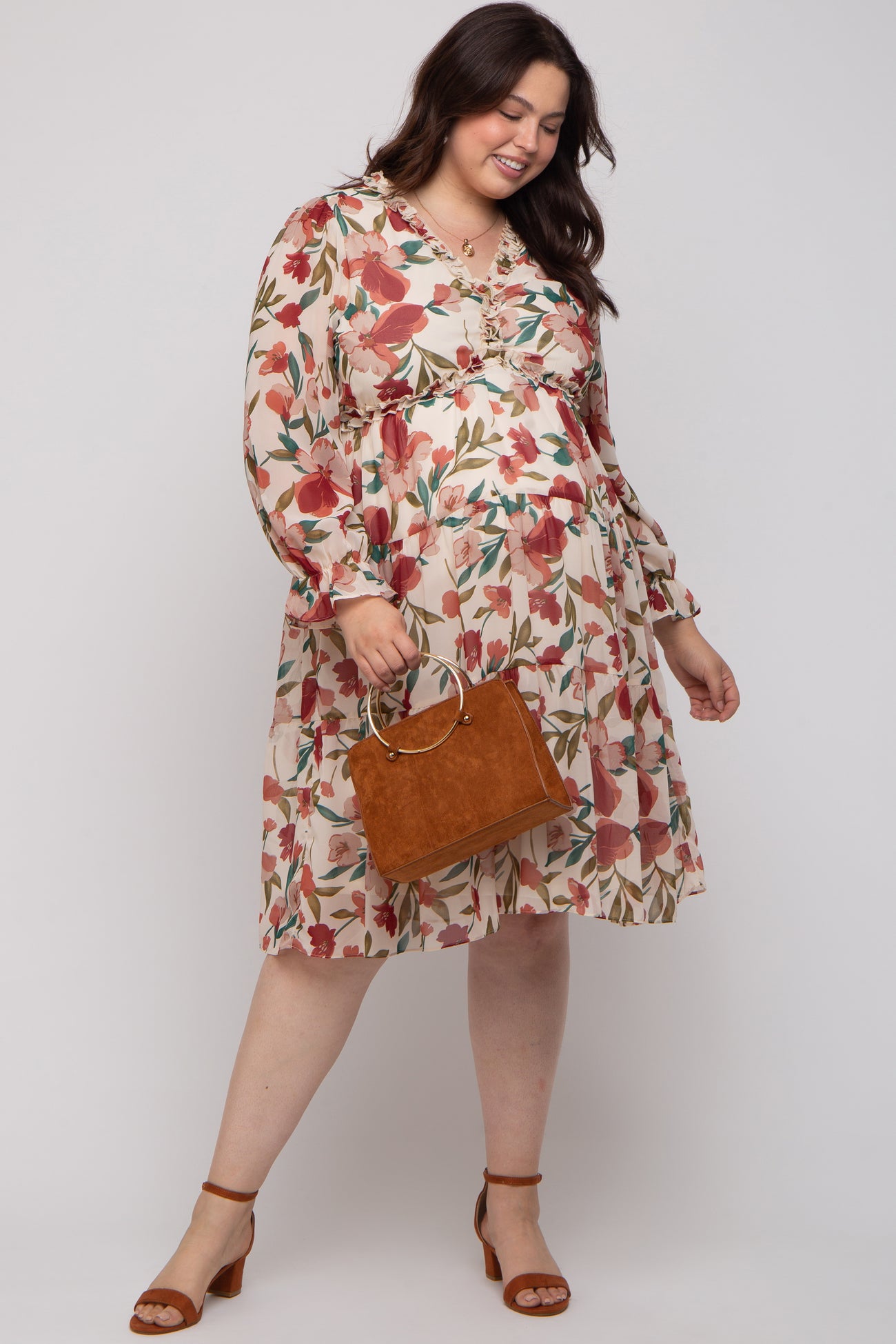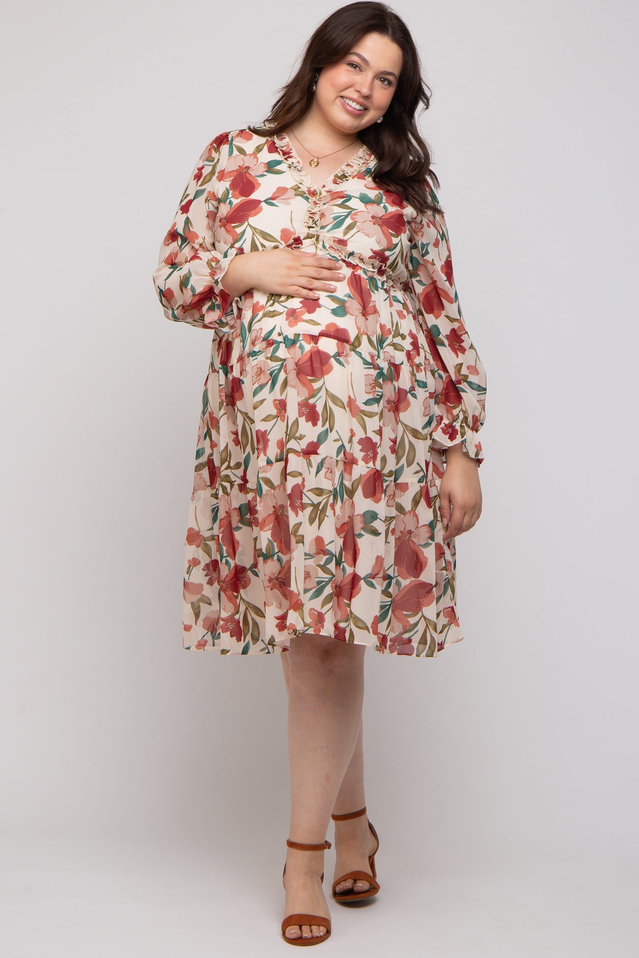 A floral chiffon maternity plus dress featuring a v-neckline with ruffle trim, long sleeves, a tiered skirt and double lining.