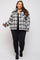 A plaid print plus shirt jacket in a thick knit with a collared neckline, two front chest pockets, button down closure and two side pockets.