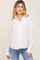 A solid maternity blouse in a plisse pleated material. Includes collared neckline, ruffle hem and button front closure. Semi sheer and unlined.