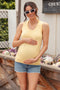 A chambray maternity dress featuring a v-neckline, front button accents, ruffled cap sleeves, and a tiered skirt.
