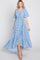 Details A floral print midi dress featuring a wrap front with adjustable ties, flowy short sleeves and a ruffle hi-low hem. Content + Care