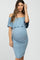 A solid hued fitted maternity dress featuring an off shoulder ruffle neckline and ruched sides.