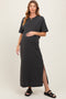 A knit maternity skirt set featuring a cropped top with a v-neckline and dropped shoulder long sleeves and a midi skirt with an elastic waistband.