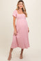 A solid hued maternity blouse featuring short sleeves and a v-neckline.