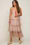 A solid lace maternity midi dress with puff sleeves, lace up detail on bust, back zipper closure and cutout back detail with tie. Dress is double lined.