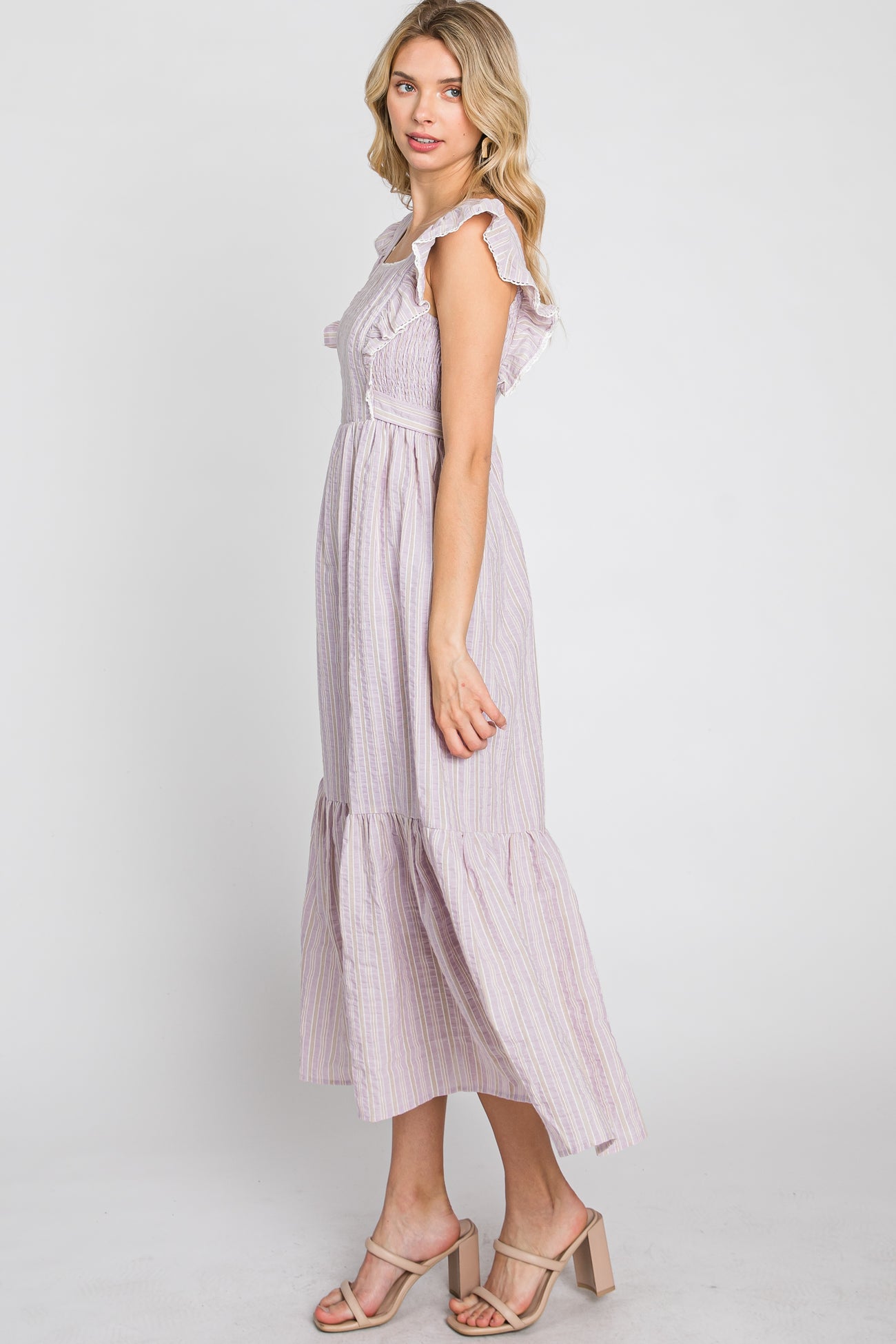 Lilac Striped Ruffle Accent Pinafore Midi Dress