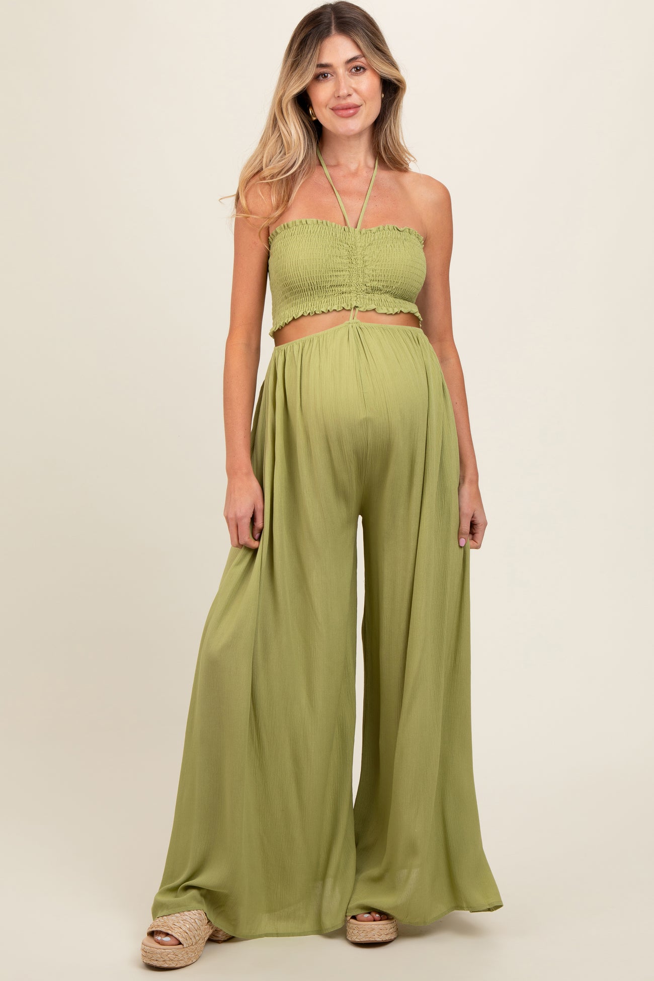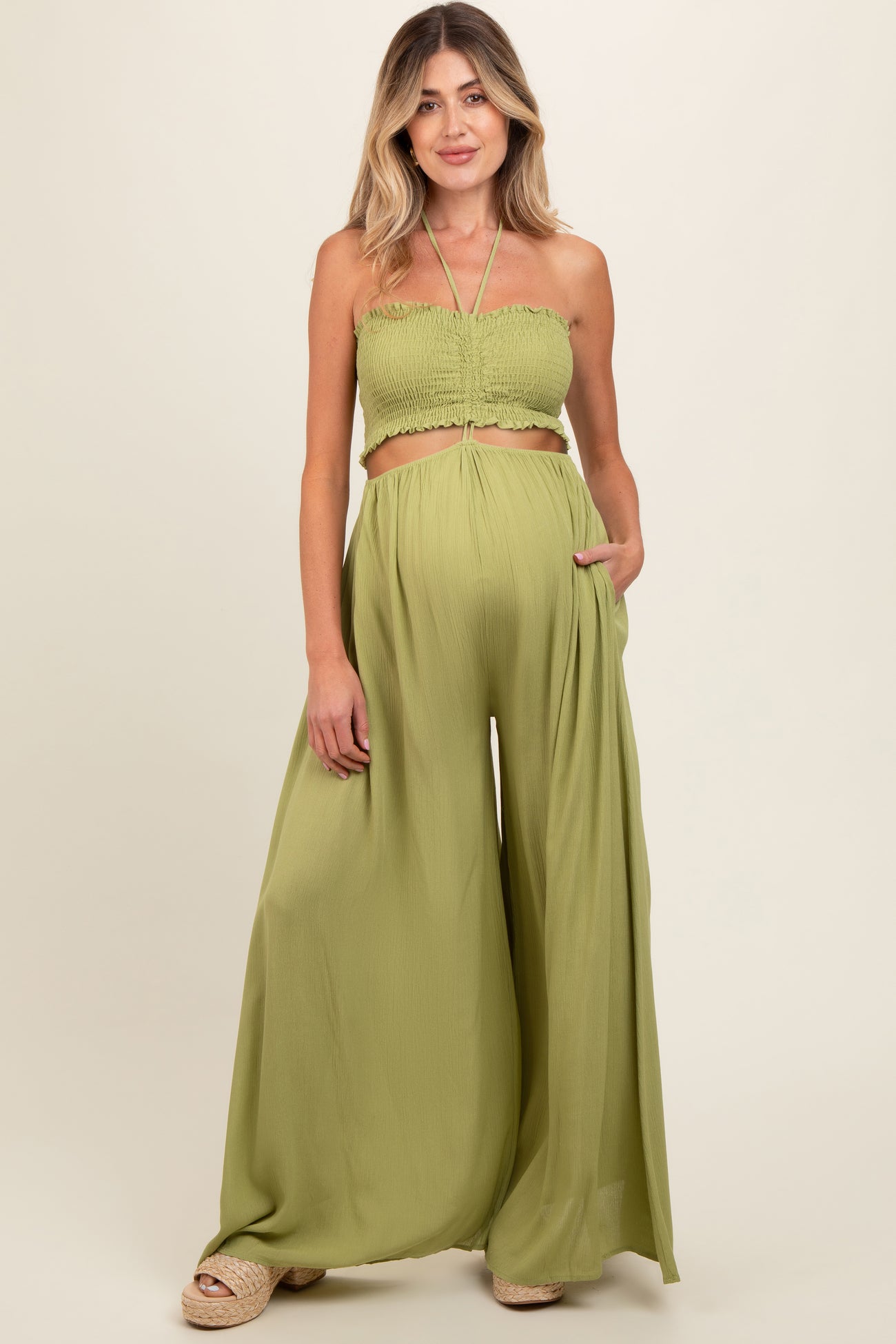 Lime Smocked Drawstring Halter Side Cutout Maternity Jumpsuit