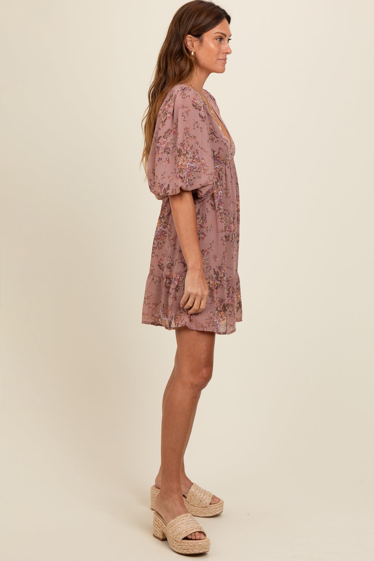 Mauve Deep V-Neck Tie Back Floral Mini Dress