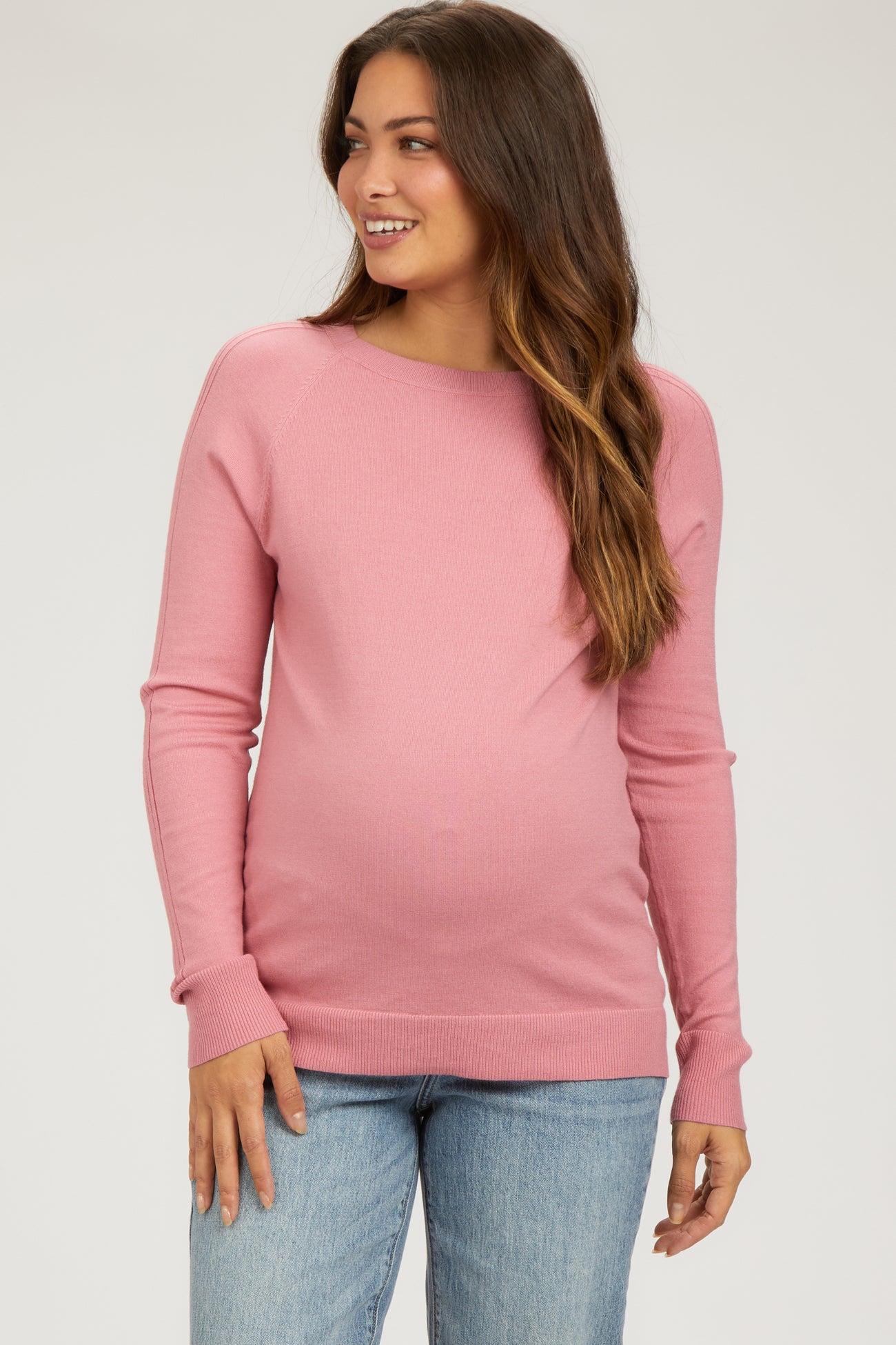 A solid knit maternity top featuring long sleeves and a rounded neckline.