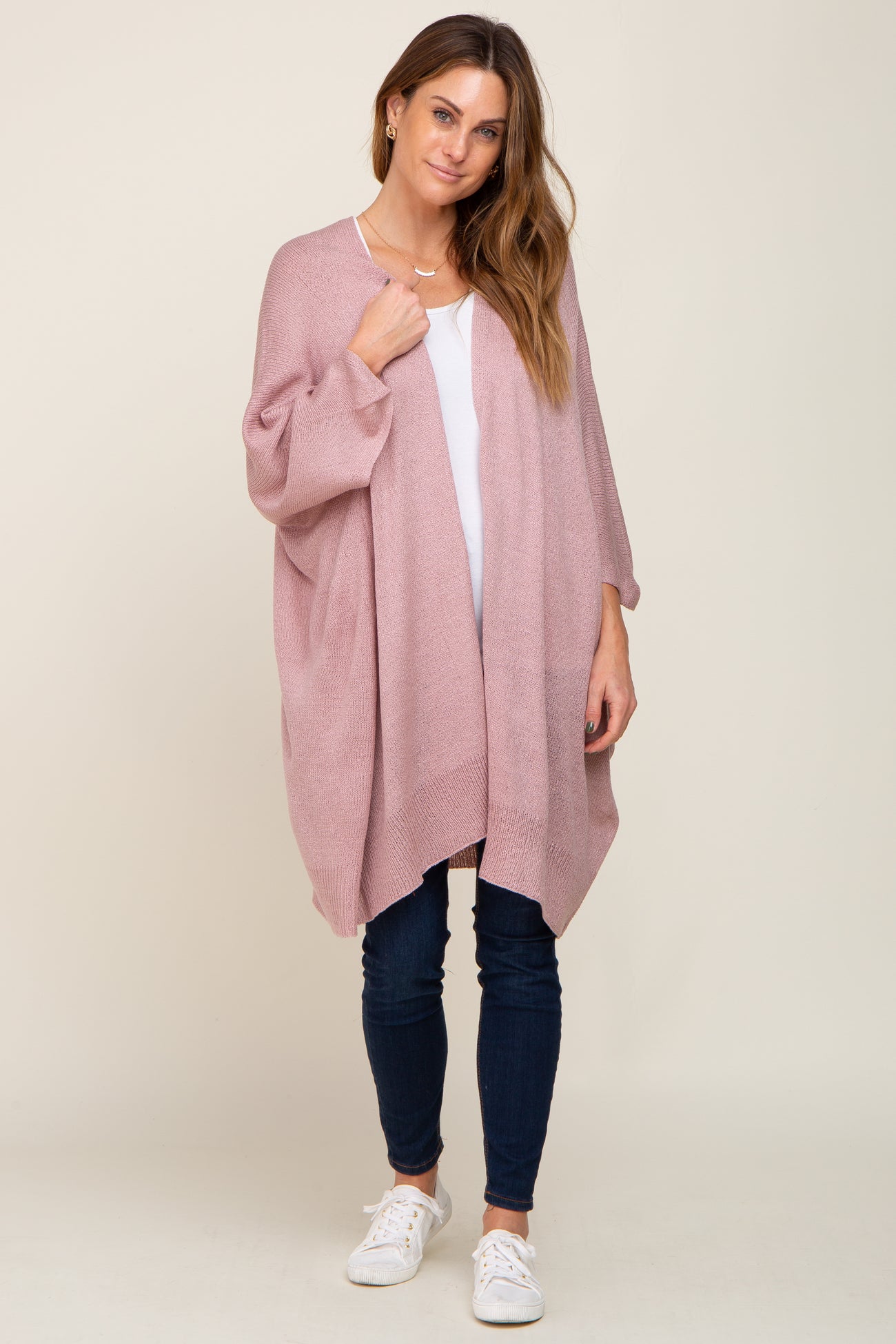 A solid hued knit maternity cardigan featuring an open front and wide sleeves.