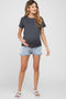 A 5-pocket maternity jean with an elastic over-belly waistband and distressing at the knees.