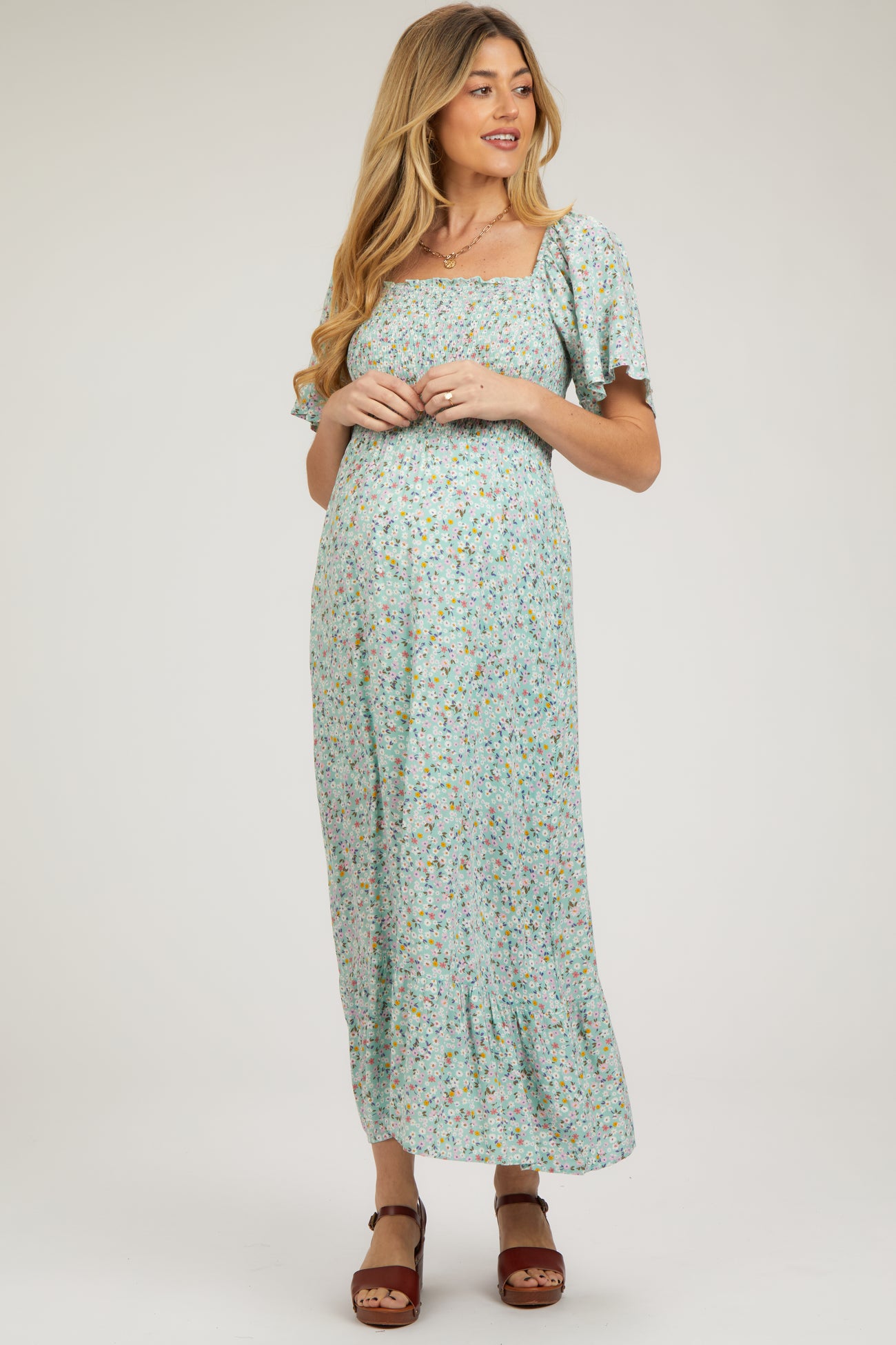 A floral print maternity maxi dress featuring short sleeves, a smocked top, a ruffle hem and a square neckline.