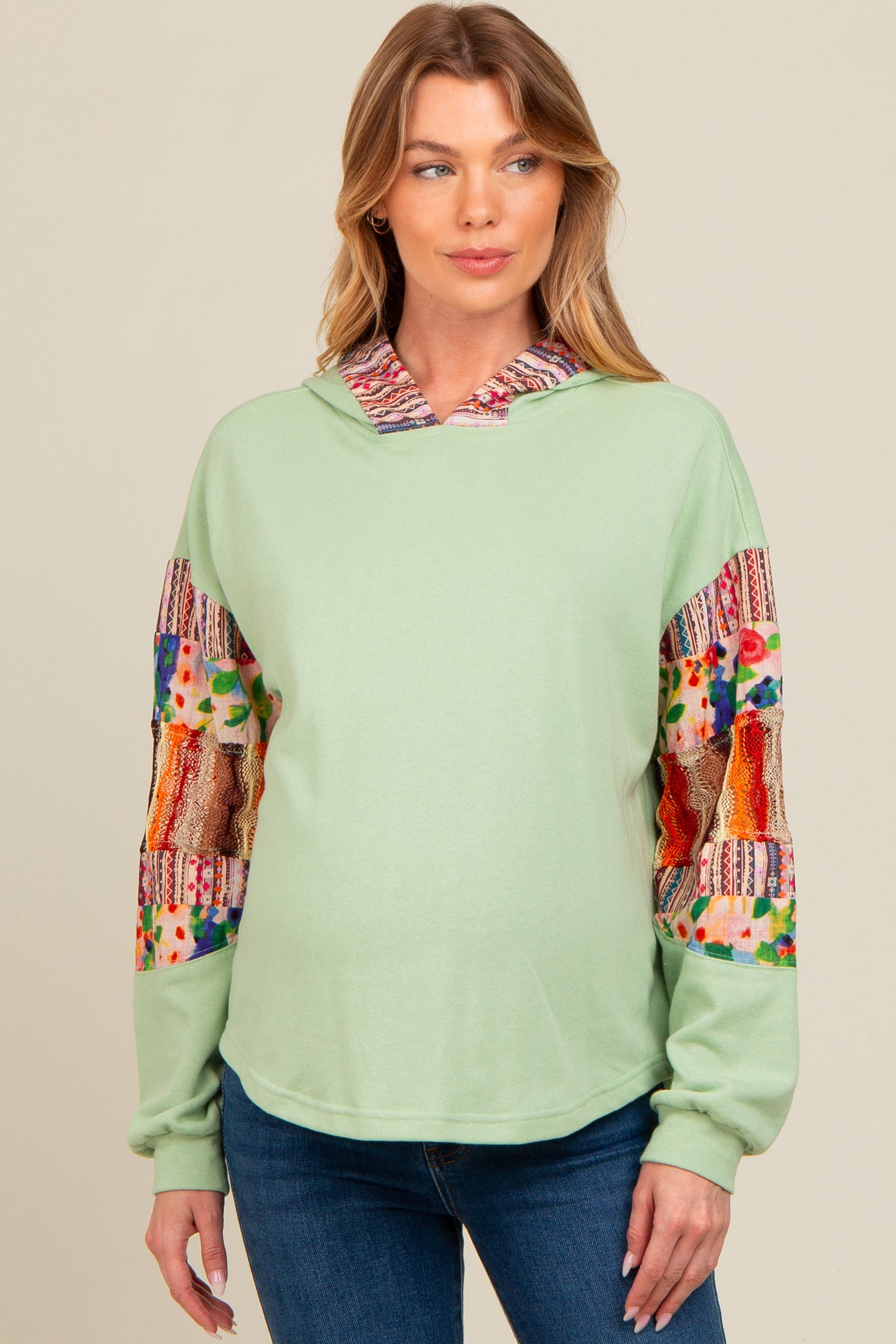Mint Green Contrast Print Sleeve Hooded Maternity Top