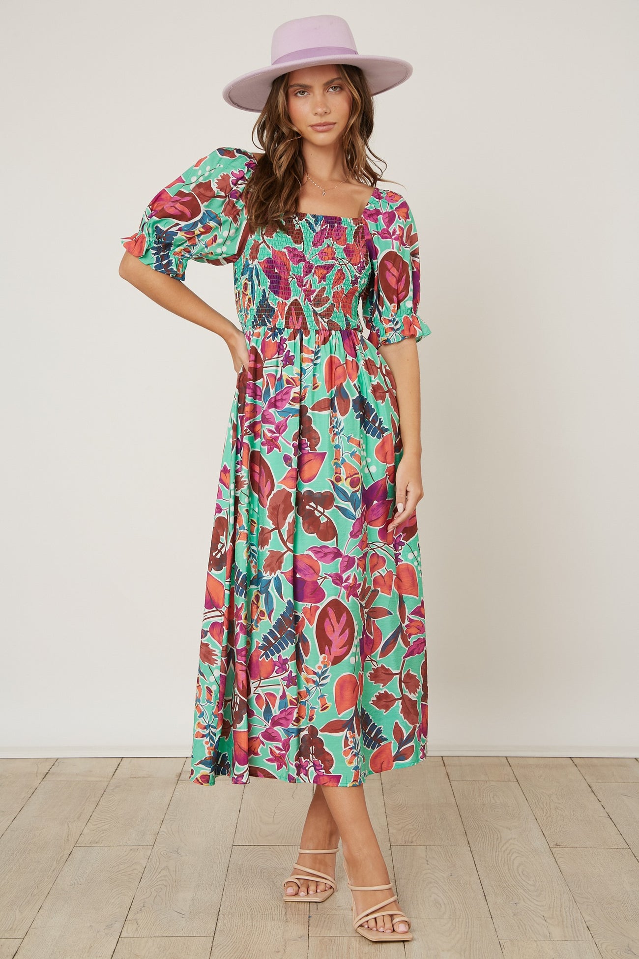 A floral maxi dress with puff sleeves and a smocked square neckline.