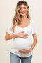 A ribbed maternity top featuring short puff sleeves, side ruching and a square neckline.