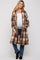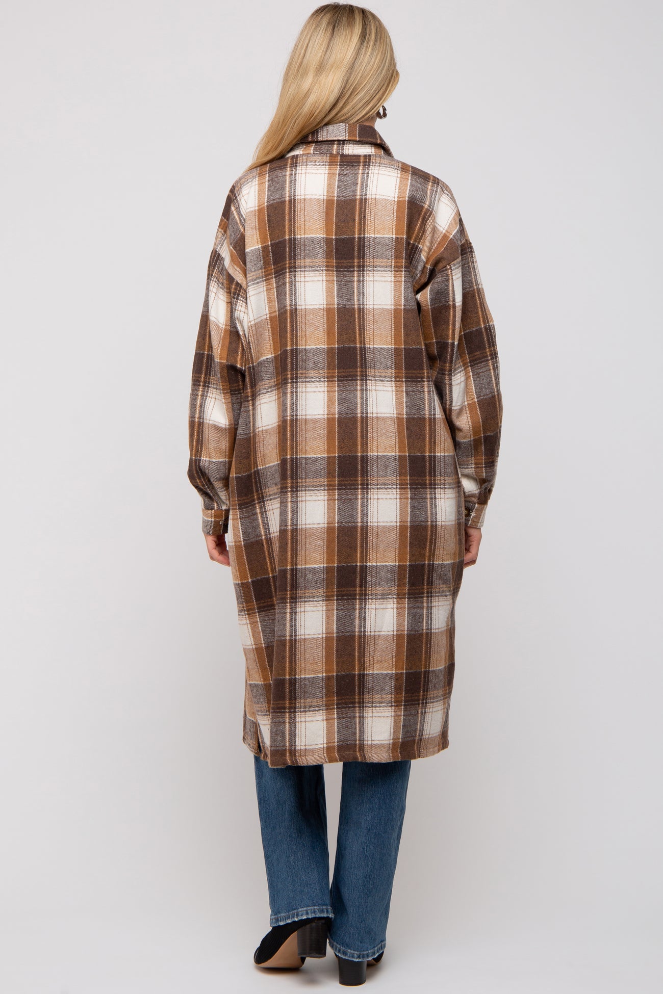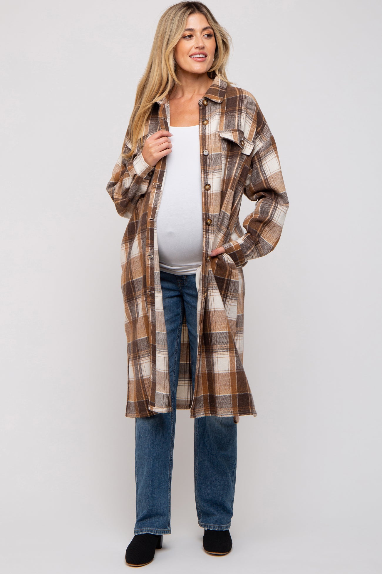 A long plaid maternity coat featuring front buttons, front pockets, side pockets, long sleeves, side slits and a collared neckline.
