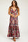 A floral print maternity maxi featuring a v-neckline, a front twist, a cutout under the bust, adjustable straps, a smocked back, and a tiered skirt.