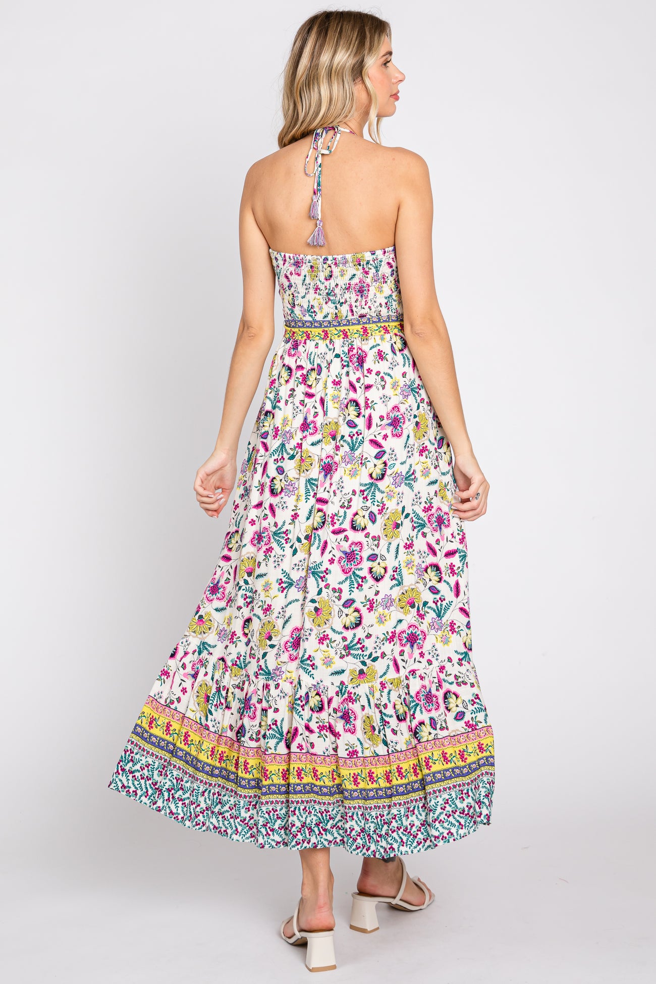A floral midi dress. Features a halter tie, a cinched top, a smocked back, and a waist tie. Skirt is partially lined.