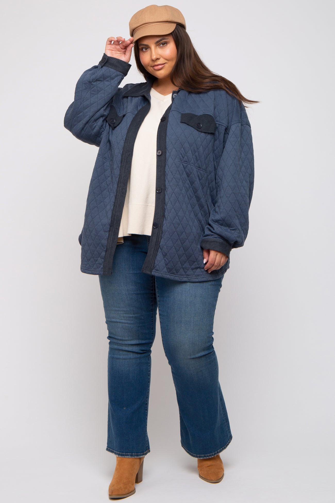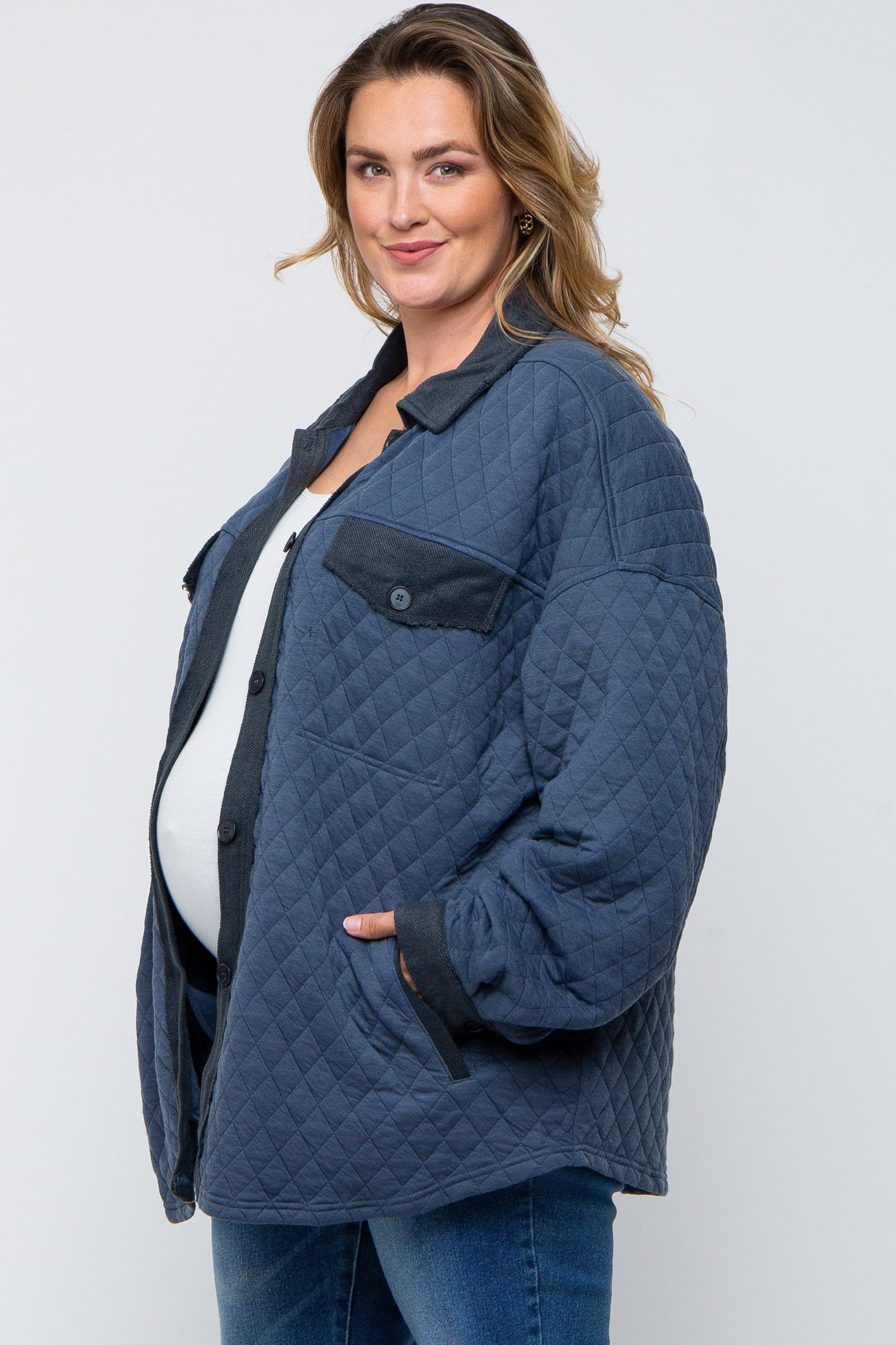 Details A solid oversized maternity plus shirt jacket with a collared neckline, button down front, two faux check pockets and two side pockets. Content + Care