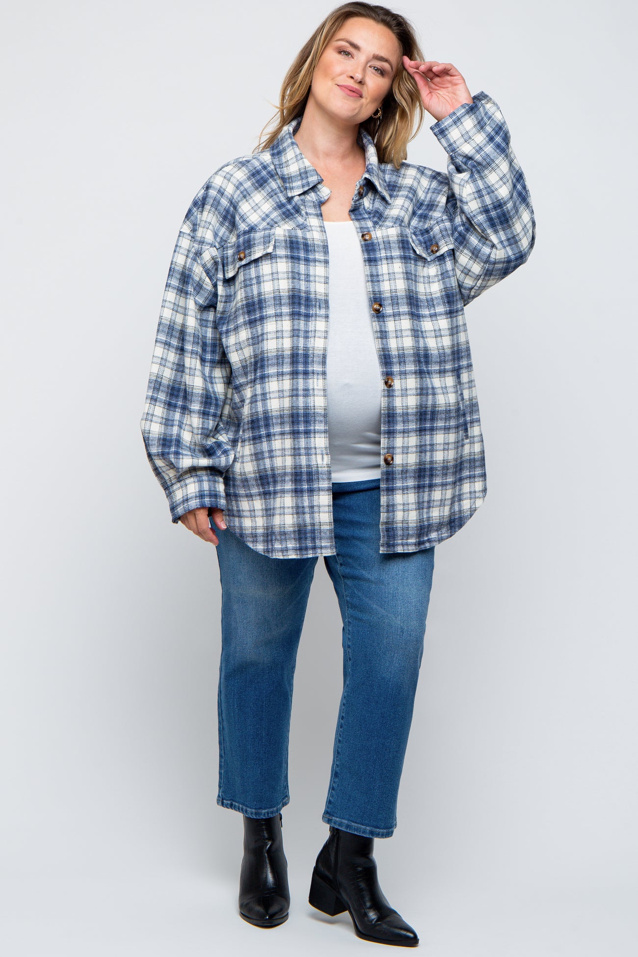 Navy Blue Flannel Plaid Button Up Maternity Plus Shacket