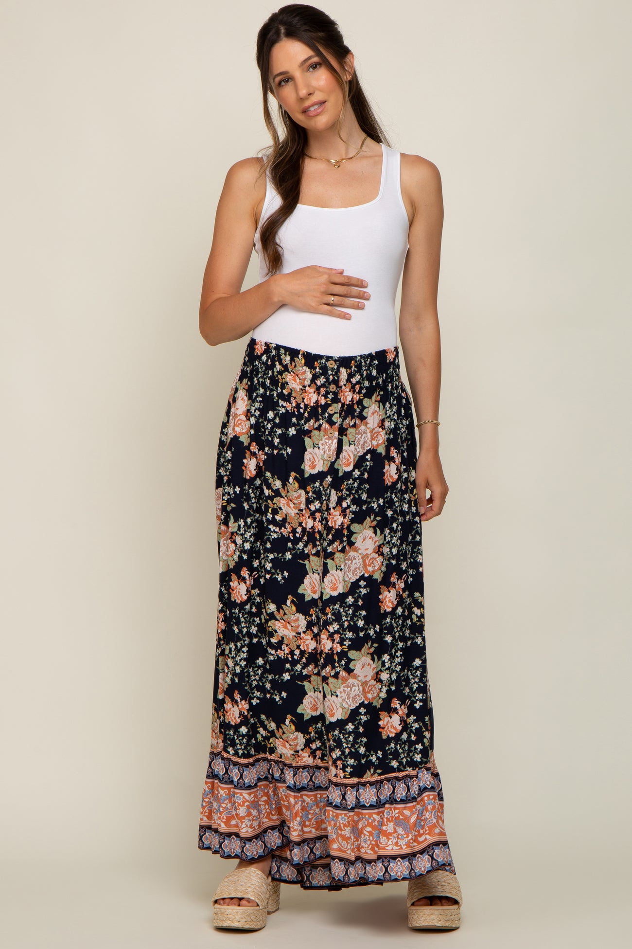 Navy Blue Floral Border Print Smocked Waist Button Front Maternity Maxi Skirt