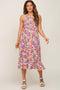 A solid hued, long sleeve dress featuring ruching on left side for a form-fitting silhouette, a faux wrap front hem, and a rounded neckline.