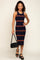 A striped ribbed knit midi dress featuring a rounded neckline.