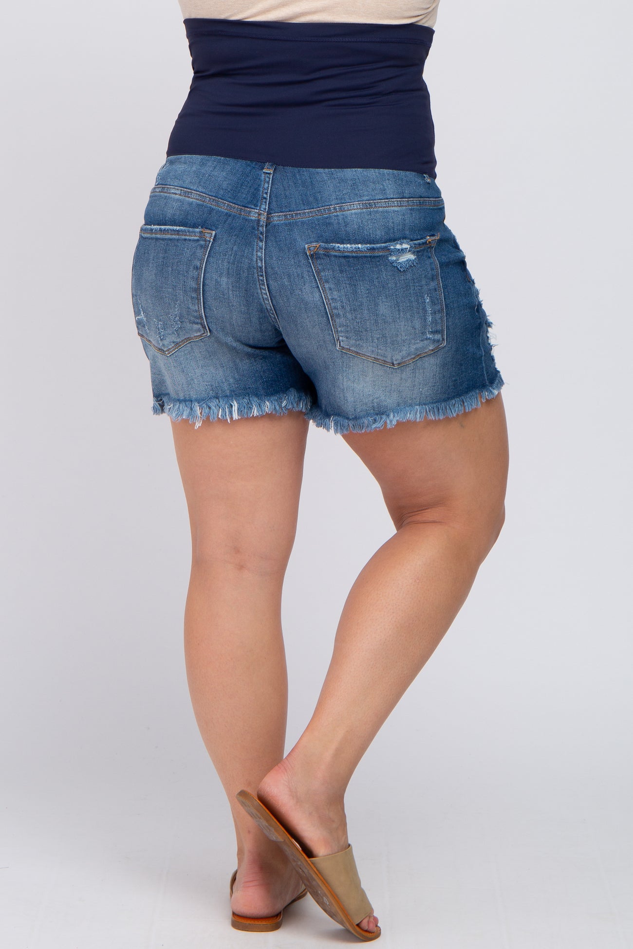 Navy Distressed Frayed Hem Plus Maternity Shorts