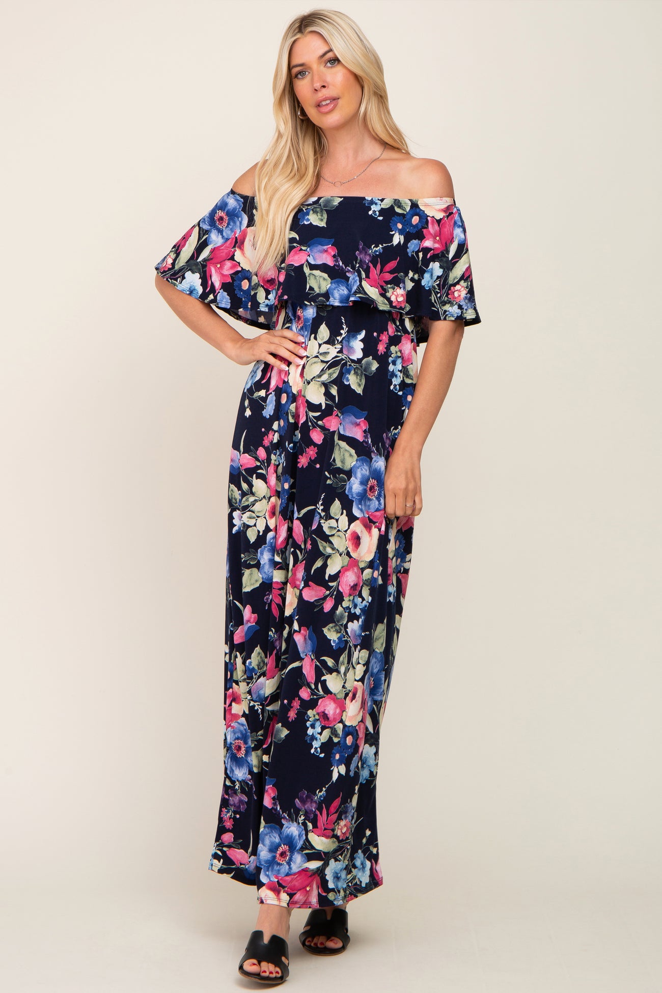 Navy Floral Off Shoulder Flounce Maxi Dress