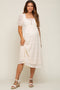 A floral print chiffon maternity midi dress with long sleeves and a tiered skirt. Features button down and lace details on bust, cinched tie waist and ruffle accents on skirt. Body is lined, sleeves are semi sheer.