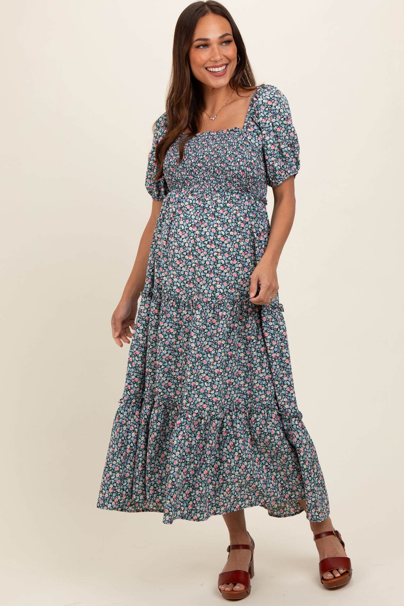 Navy Floral Smocked Tiered Puff Sleeve Maternity Maxi Dress