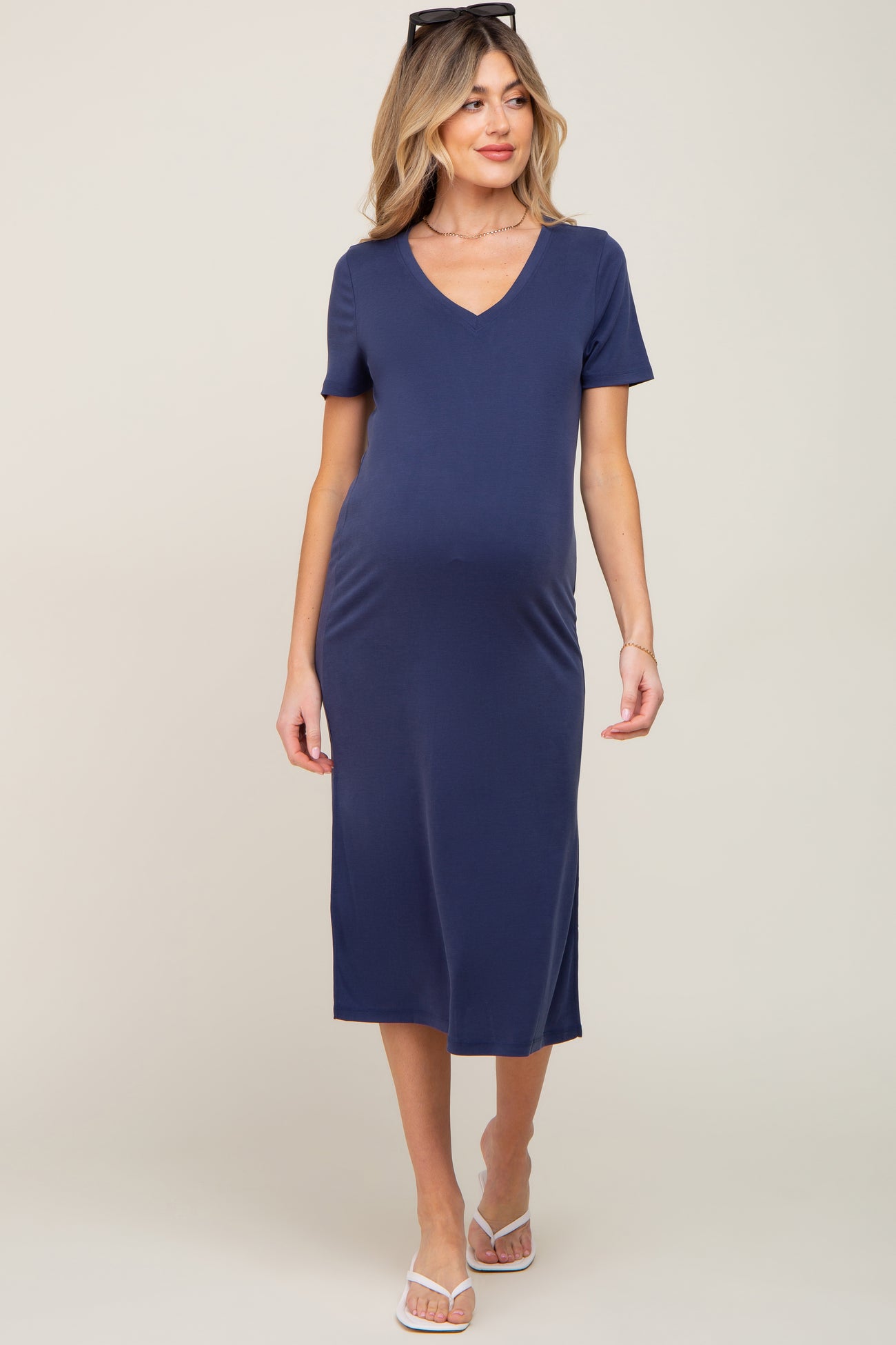 Navy V-Neck Short Sleeve Side Slit Maternity Midi Dress